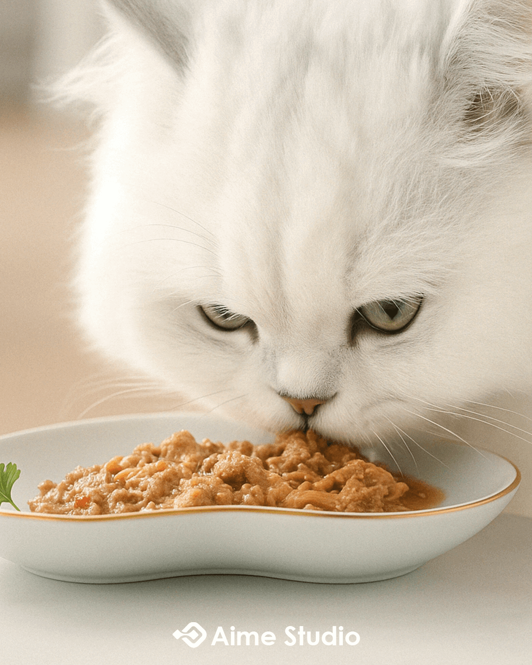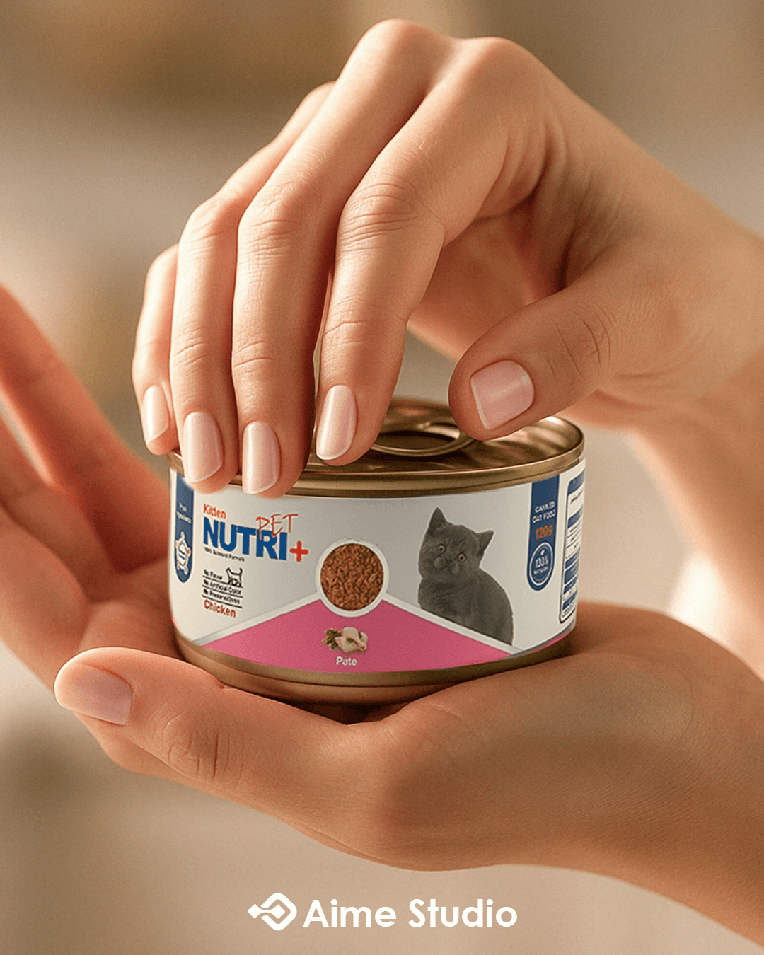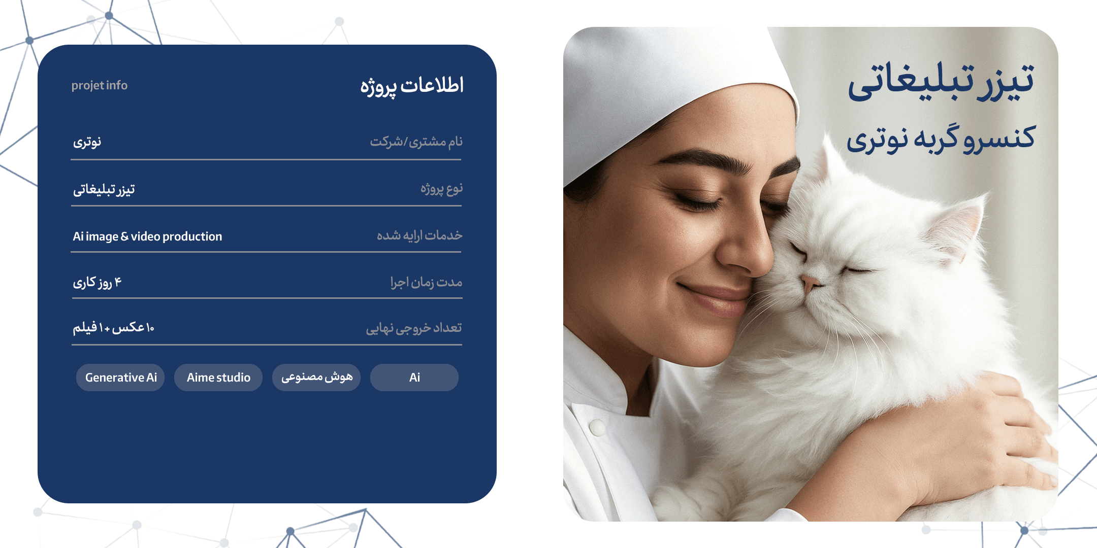 محصول معرفیشده، کنسرو غذای گربه است که با حضور یک مدل گربه پرشین و مدل خانم، در فضایی شبیه به آشپزخانه به تصویر کشیده شده است تا حس استفاده روزمره و واقعی محصول بهخوبی منتقل شود.